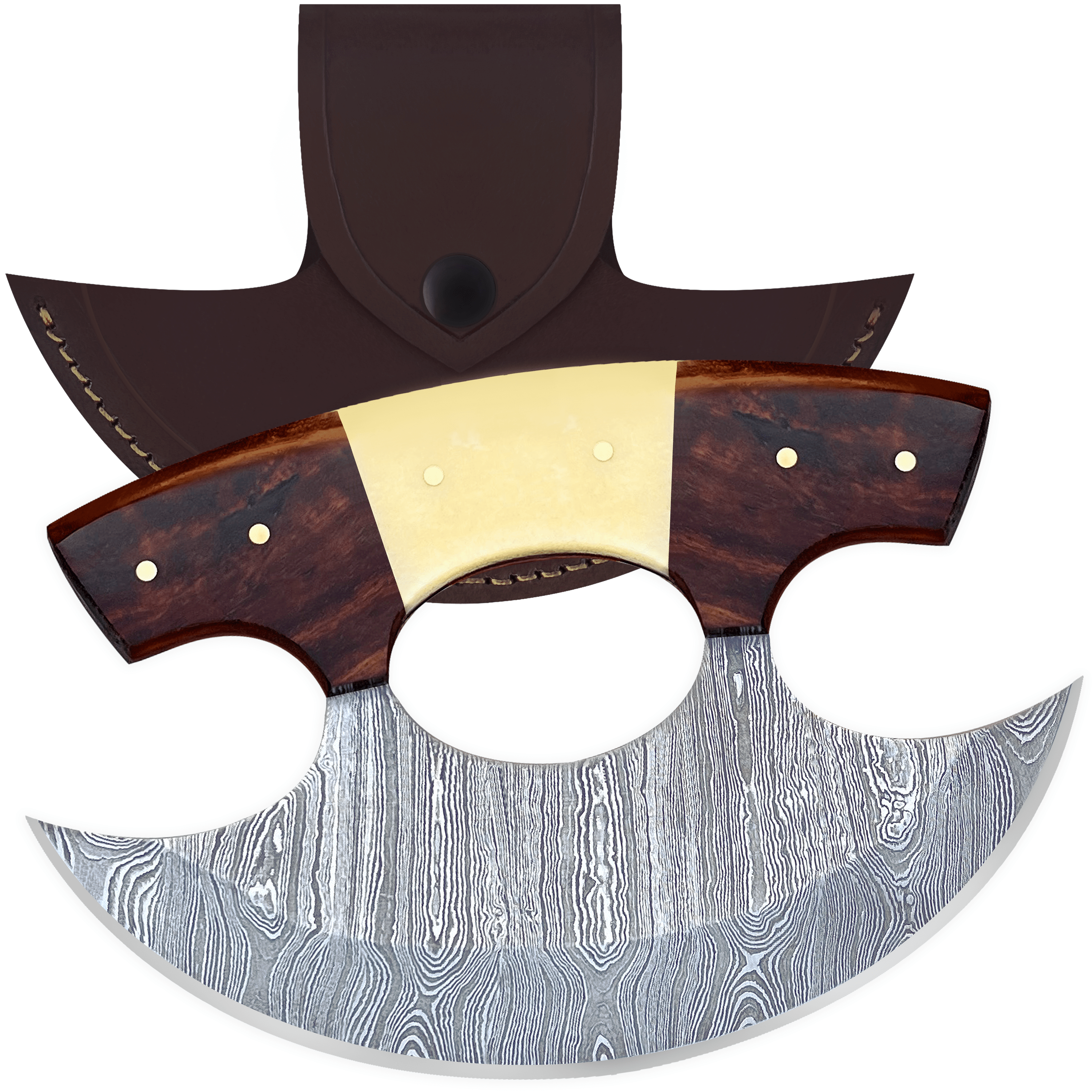 Experience the art of cutting with the Damascus Steel Alaskan Ulu. This traditional crescent-shaped Ulu features a premium Damascus steel blade and an ergonomic wood and bone handle, making it perfect for slicing, dicing, and chopping in the kitchen. Complete with a stylish leather sheath for protection and storage.